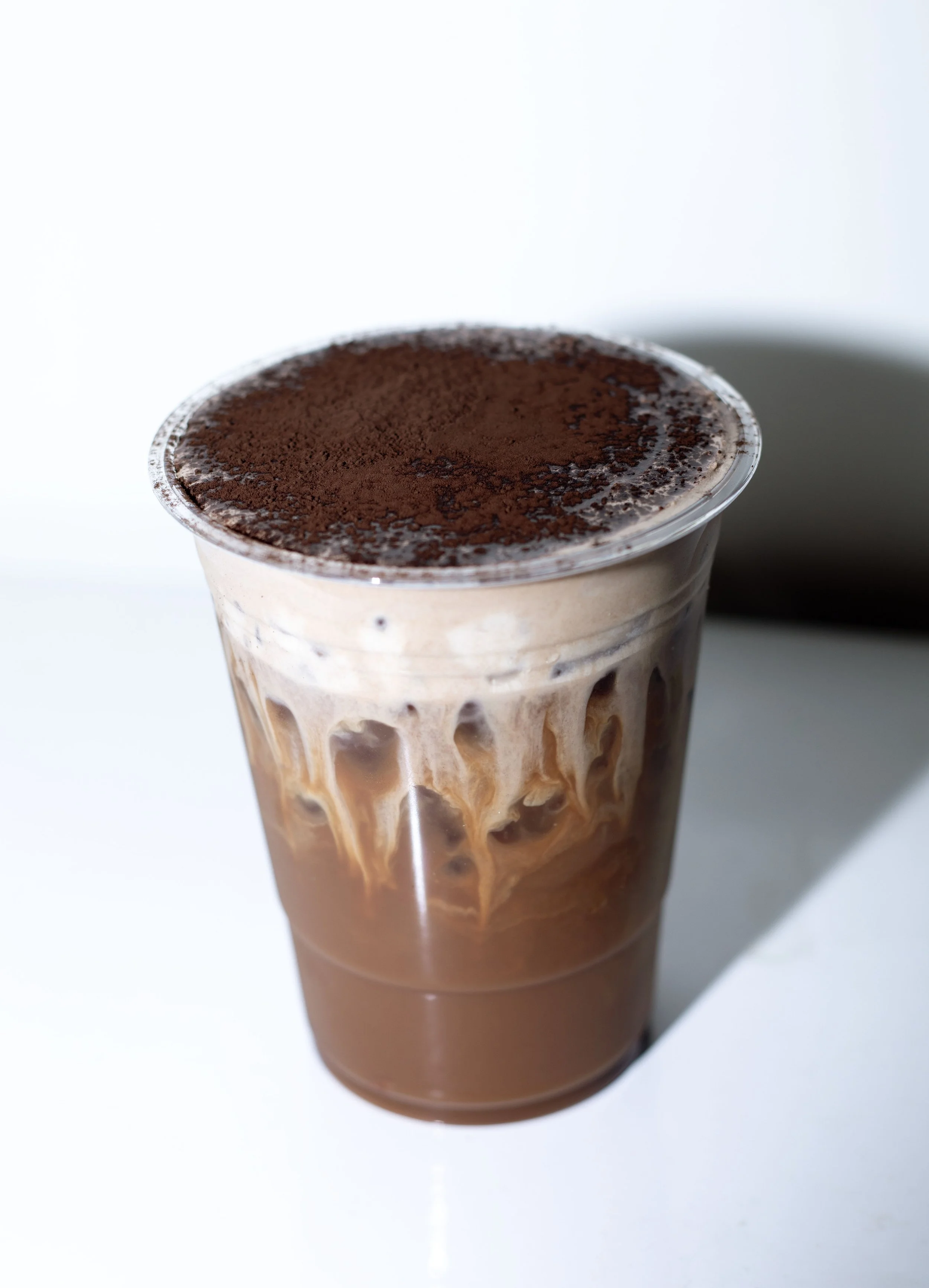 Dark Chocolate Iced Americano with a Dark Chocolate Cloud Garnished with Black Cocoa Powder.